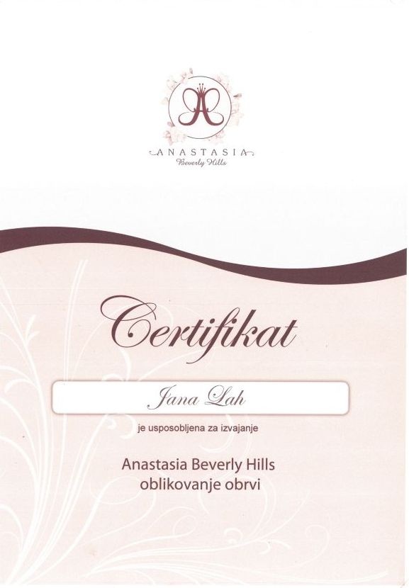 Potrdilo o opravljenem tečaju za oblikovanje obrvi po sistemu Anastasia